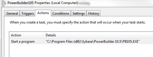 4. Click on the Actions tab and then browse for the Application you want to open. In my case PowerBuilder